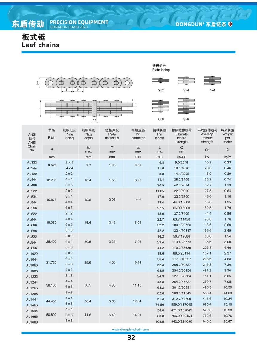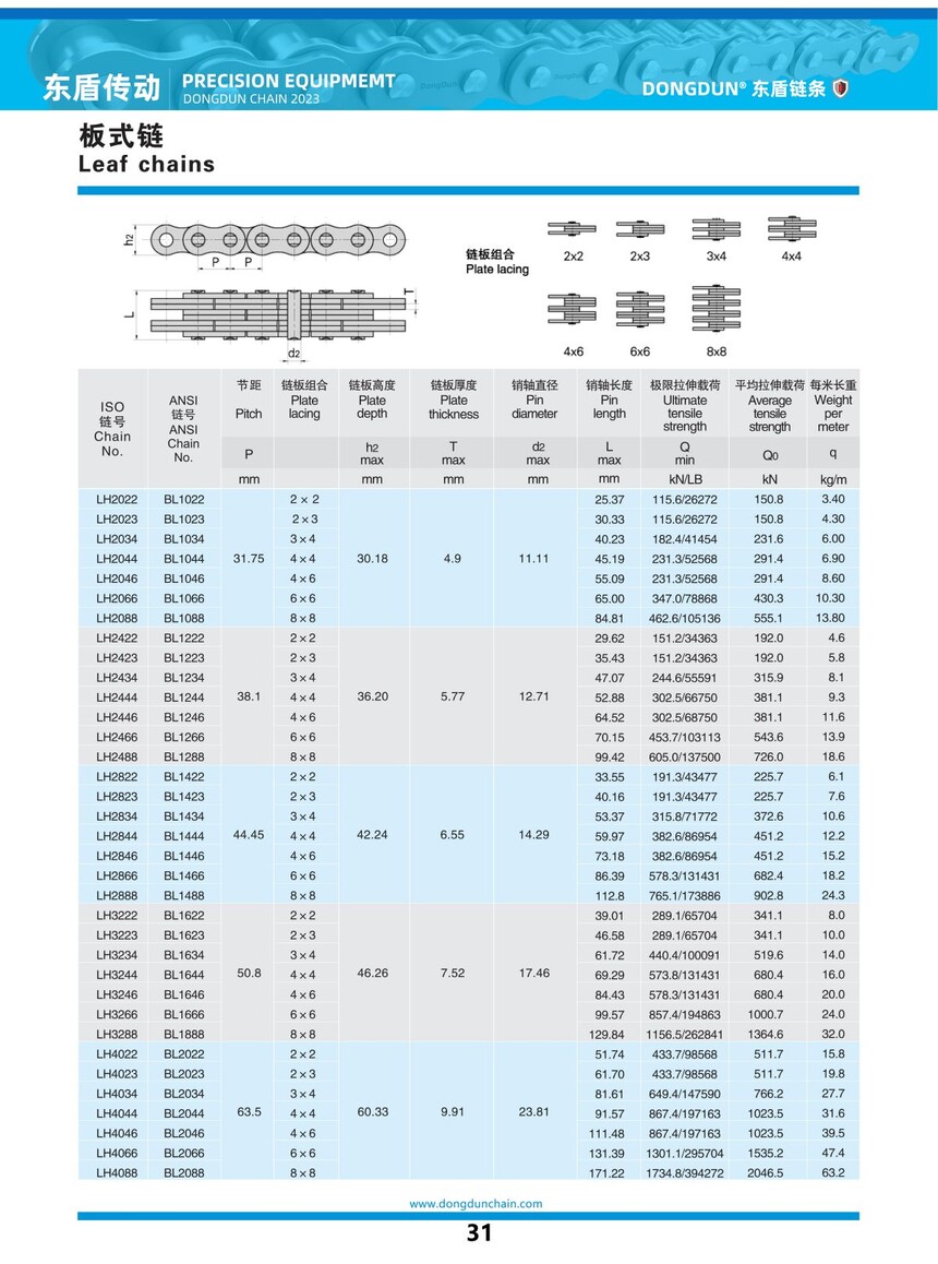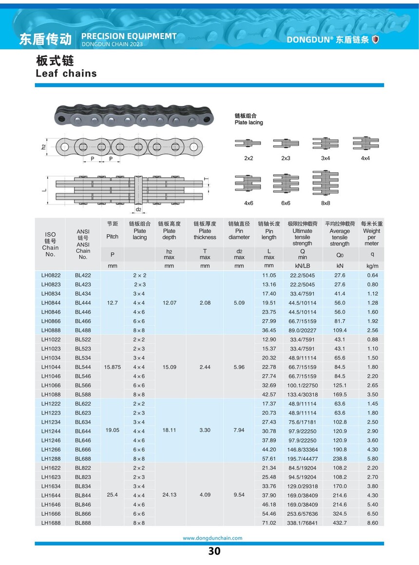 板式链符合ISO 4347、ASME B29.8M、JIS B 1804等标准,主要有LH (BL) 系列、LL系列和AL系列,以及由标准系列衍生的其它链号的板式链,节距范围5.94mm ~ 76.2mm,可根据主机用户的特殊要求进行非标定制,并可配套供应各种类型连接环(端接头)、特殊连接件等附件。