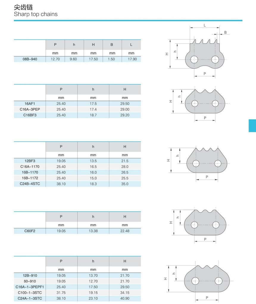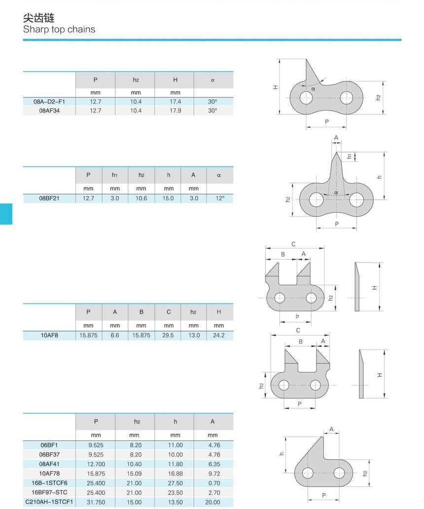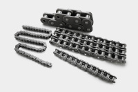 链条参照ANSI、DIN等标准,主要有圆销式齿形链、滚销式齿形链。